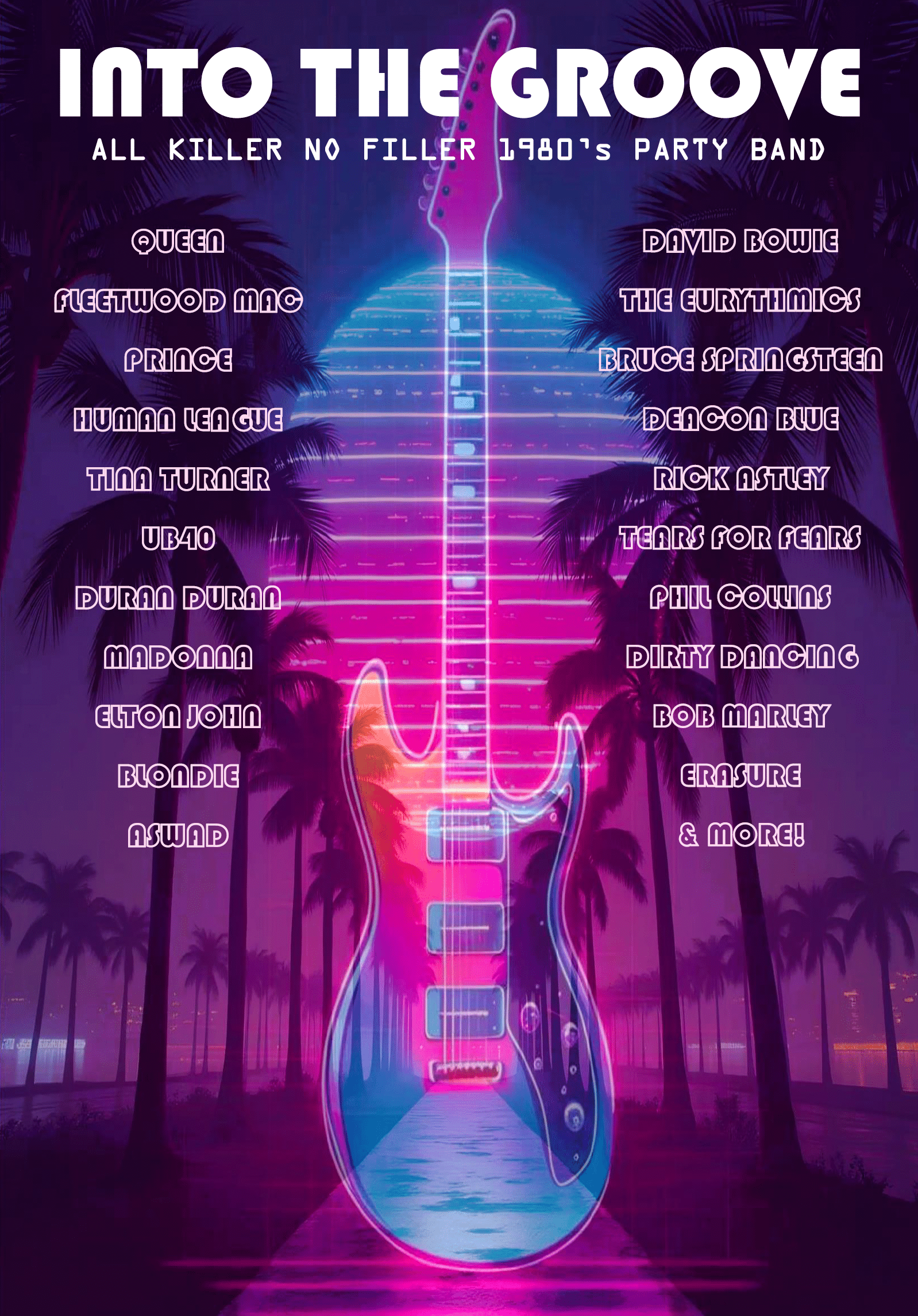 Featuring fantastic male and female lead vocals, accompanied by amazing guitar, this act delivers an all killer, no filler 80’s experience, perfect for your party or event.